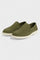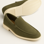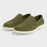 Stylish loafers for men in olive green suedette (suede-textured PU). Comfortable slip-on fit with a flexible jelly outsole and soft PU insole. Perfect for everyday wear, work, or casual outings. Vegan, easy to clean, and ideal for smart-casual style.