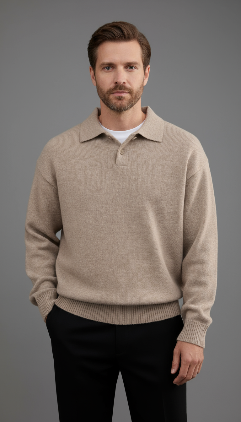 Andrew Wool Blend Fine Knit Polo Neck Button Placket Sweater Limited