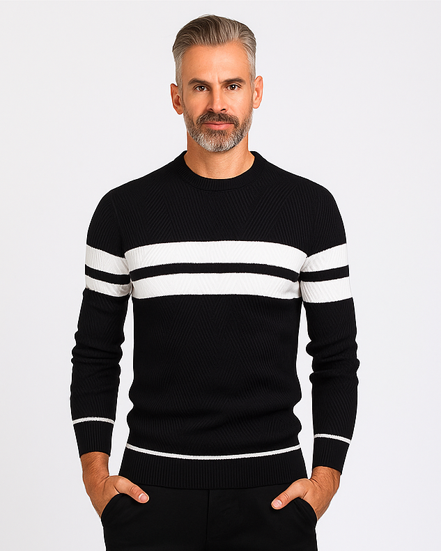 The Felix stylish men's sweater with stripes combines a classic design with a modern touch. It is made from soft, breathable knit fabric and offers a slim yet comfortable fit - perfect for casual outings, smart layering, or making a bold statement with refined style.