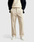 The trousers feature a loose fit with straight, wide leg openings and a mid-rise waist, finished with a flat front design, double button closure at the waist, and a YKK metal zip.