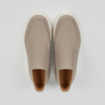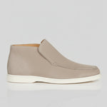 These men's suede loafer boots in greige combine neutral tones in a slip-on chukka design. With a suede upper, round toe, and flat heel, they are versatile for both casual and smart-casual outfits.
