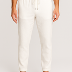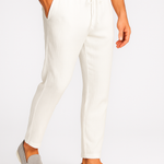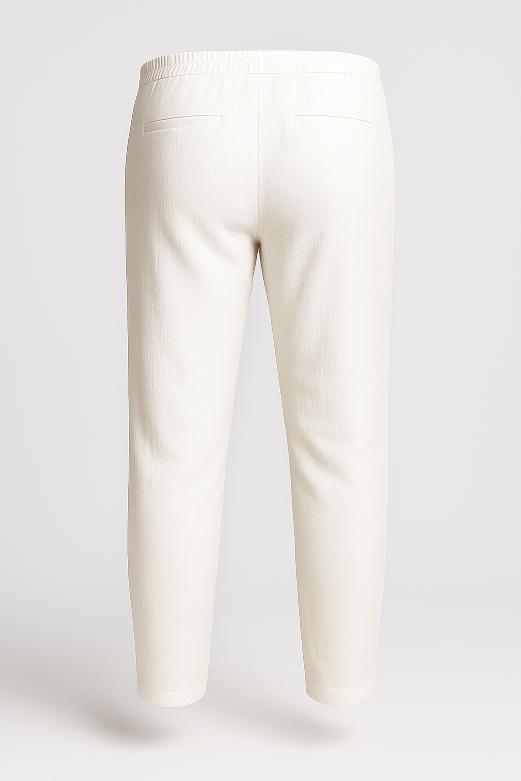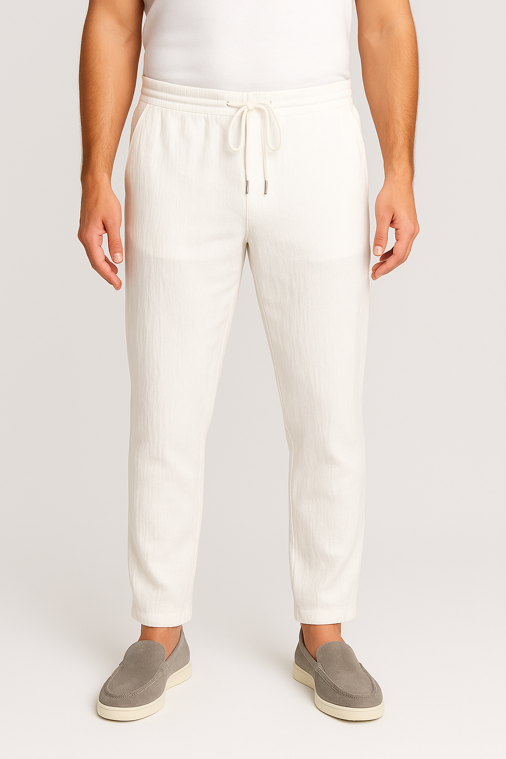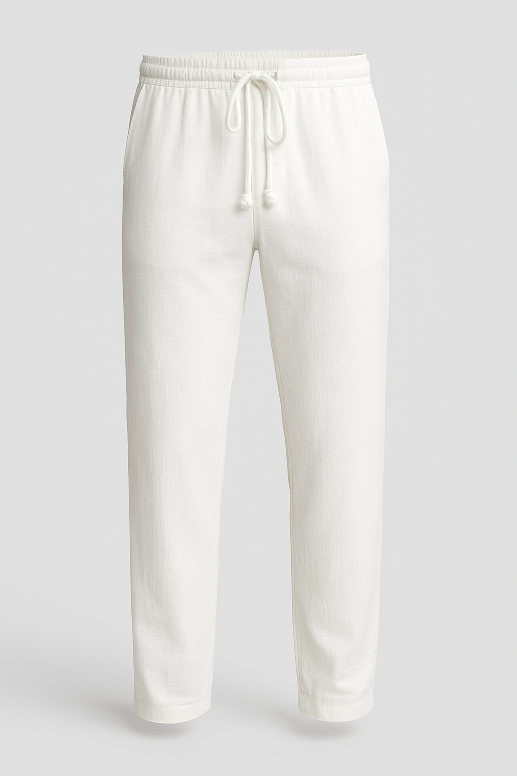 These casual men's trousers with a drawstring are perfect for everyday wear. Made from 100% woven cotton without stretch, they offer both comfort and a clean, relaxed look. With an elastic waistband, adjustable drawstring, and straight legs, they are ideal for spring and autumn weather. Practical pockets and a minimalist design make them a versatile choice in the wardrobe.